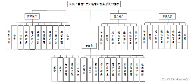 珠街“慧达”太阳能售后服务系统小程序的整体架构确定以后,再来看珠街“慧达”太阳能售后服务系统小程序的主要功能模块图。整体的功能模块包括用户端和管理端,用户端只要实现用户注册登录,主要的页面,包括首页,相关新闻、我的等页面。管理端的模块主要实现了管理员用户,有公共管理、用户管理、信息管理等。确定了模块以后,再设计各个模块的功能特点,方便抽取出各个模块的公共部分来。