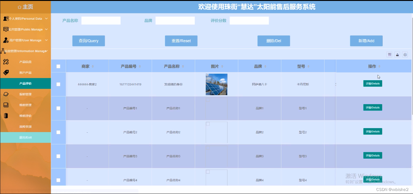 (5)产品信息:管理员点击“产品信息”会显示出所有的产品信息,支持输入商家或者产品编号对产品信息进行查询,如果想要添加新的产品信息,点击“添加”按钮,输入产品名称、图片、品牌、型号等信息,点击“提交”按钮就可以添加了,同时可以选择某一条产品信息,点击“删除”进行删除,也可以对用户提交的产品信息评论的信息进行管控;