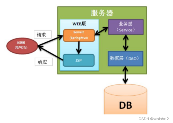 页面发送请求给控制器,控制器调用业务层处理逻辑,逻辑层向持久层发送请求,持久层与数据库交互,后将结果返回给业务层,业务层将处理逻辑发送给控制器,控制器再调用视图展现数据。