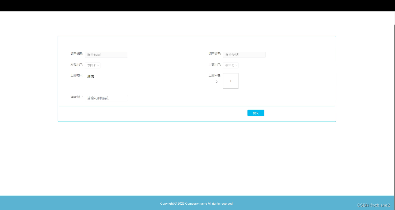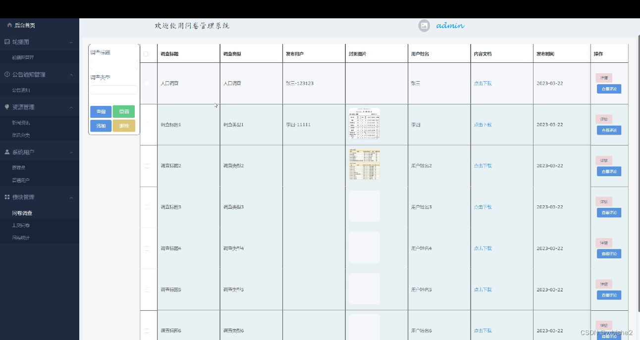 问卷调查, 在前台界面图可查看其他用户发布的调查问卷,可下载问卷回答,点赞,收藏,评论等操作,还可在后台自己发布调查问卷,也可进行重置,添加等操作,如下图所示。