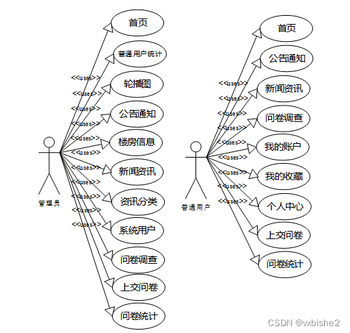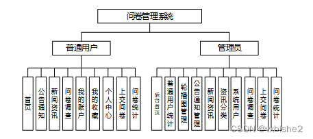 普通用户登录问卷管理系统,功能为:首页,公告通知,新闻资讯,问卷调查,我的(我的账户,我的收藏,个人中心),后台首页,模块管理(问卷调查,上交问卷,问卷统计)等功能,如下图所示: