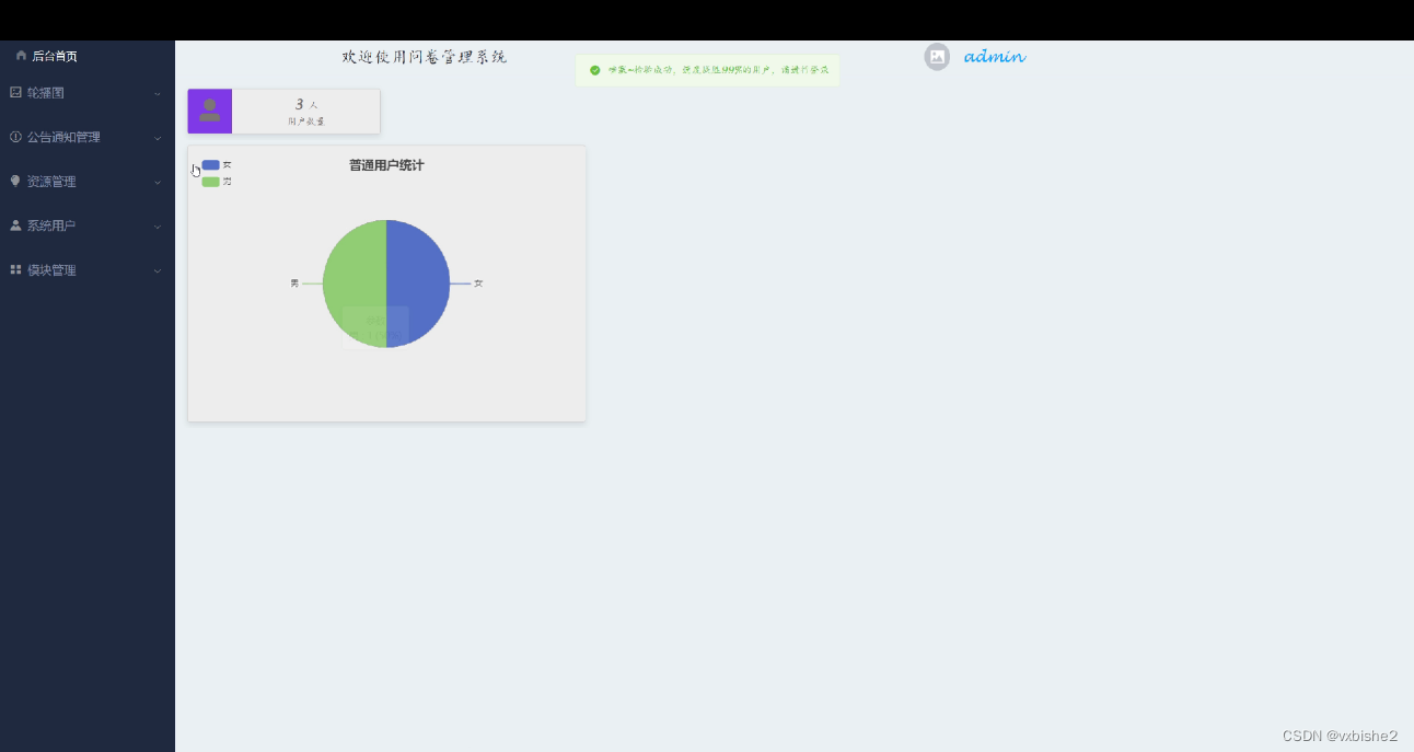 (1)功能要求:首页,普通用户统计,轮播图管理,公告通知管理,资源管理(新闻资讯,资讯分类),系统用户(管理员,普通用户),模块管理(问卷调查,上交问卷,问卷统计)等功能模块。
