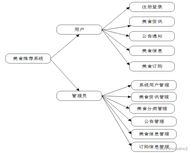 (3)确定好系统使用的技术,进行在线确认系统所划分的用户角色,并且根据用户角色划分确定所要设计的功能模块,对美食推荐系统的设计主要划分别为管理员和用户角色,并所使用的功能模块也相应不同,但是系统的数据库实现的内容是交互的,用户可以随时根据自己的需求进行美食信息查看以及购买,对于系统工作人员可以根据自己的分管内容进行在线信息的处理及操作,管理员获取到所有用户的详细数据信息,并根据需求进行第一时间处理解决。
