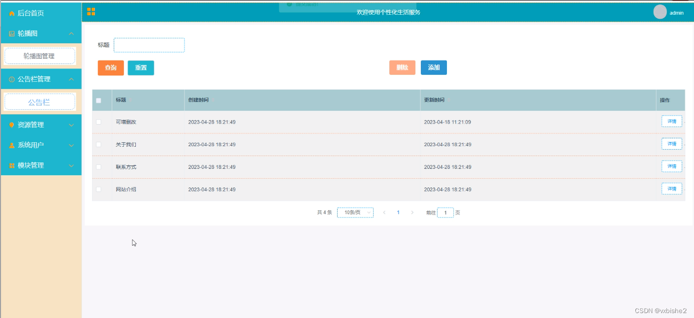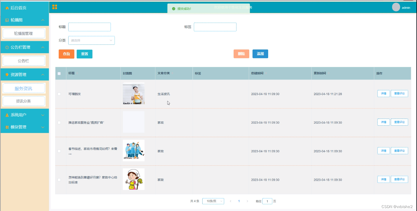 3、功能的完善性:可以管理后台首页、轮播图(轮播图管理)、公告栏管理(公告栏)、资源管理(服务资讯、资讯分类)、系统用户(管理员、注册用户)、模块管理(服务分类、生活服务、服务订单)、个人中心模块的修改维护操作。