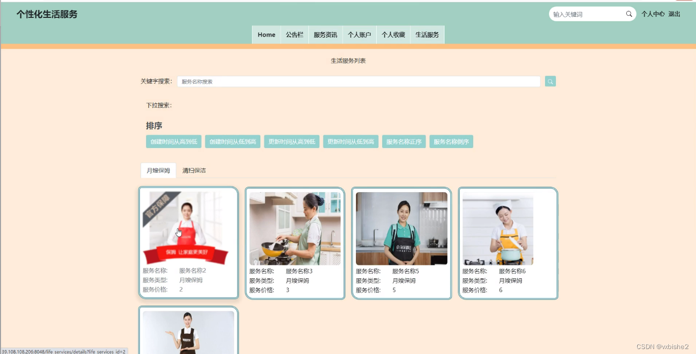 生活服务,在生活服务页面可以查看关键字搜索、排序、月嫂保姆、清扫保洁、服务名称、服务类型、服务价格等详细进行提交,如图5-2所示。