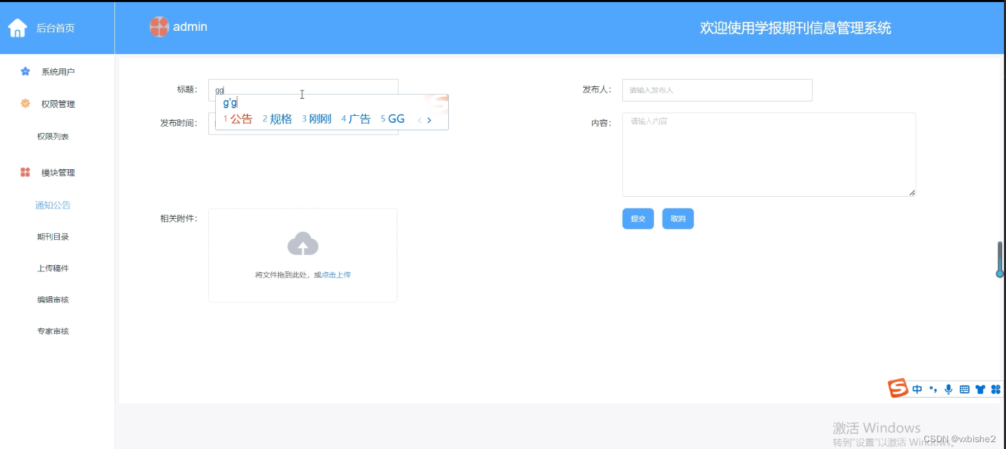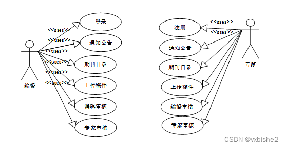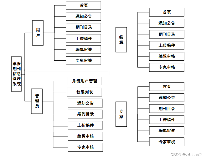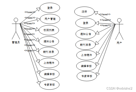 学报期刊信息管理系统的功能主要分为前台用户根据自己的需求进行注册登录,通知公告、期刊目录、上传稿件、编辑审核、专家审核进行操作。后台系统管理员因职责的不同,管理员主要对注册用户、通知公告、期刊目录、上传稿件、编辑审核、专家审核进行处理。