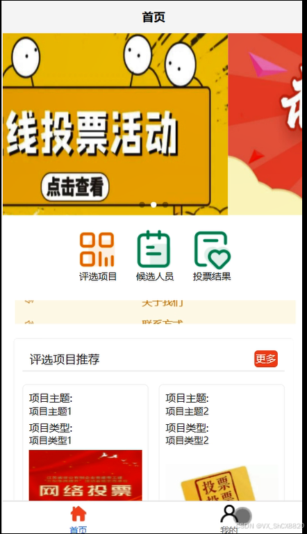 在首页,用户可以轻松访问评选项目、候选人员投票结果、通知公告和我的(等多种功能,如图5-3所示,为用户提供了更加便捷的服务。