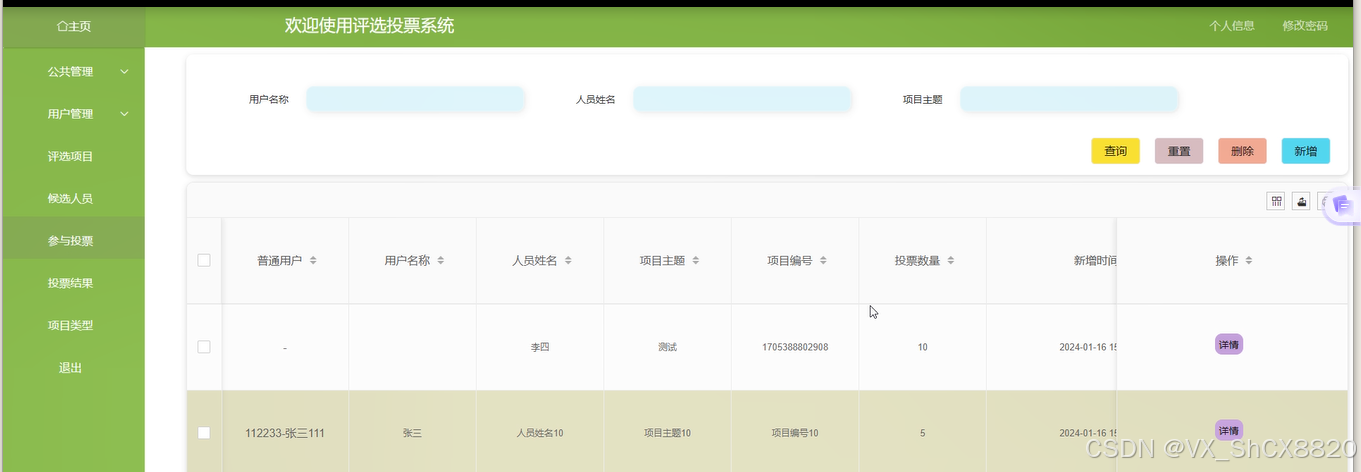 参与投票:管理员可通过搜索人选姓名和项目主题进行搜索候选人进行投票,界面图如下。
