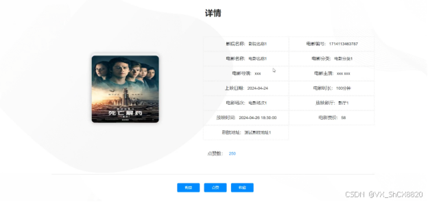 (6)电影信息:用户可以查看电影的所有信息,包括影院名称、电影编号、电影名称、电影分类、电影导演、电影主演、上映日期、电影时长、电影场次、放映影厅、放映时间、电影票价、影院地址、电影介绍等。支持通过电影名称或电影分类搜索的方式对电影信息进行查询,在查询到自己想要了解的电影信息的时候,可以进入查看详细的介绍,点击“购票”这一按钮以后会跳转到电影购票信息填写的界面,根据提示填写好购票的信息,点击“提交”以后购票就完成了,在电影信息详情这个界面,同时支持用户对喜欢的电影信息进行收藏、点赞以及评论的功能。
