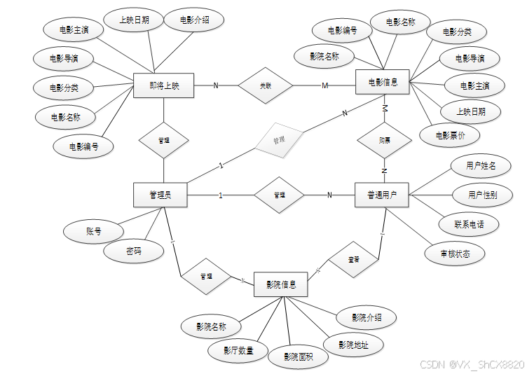 下面是整个电影院购票管理系统中主要的数据库表总E-R实体关系图。