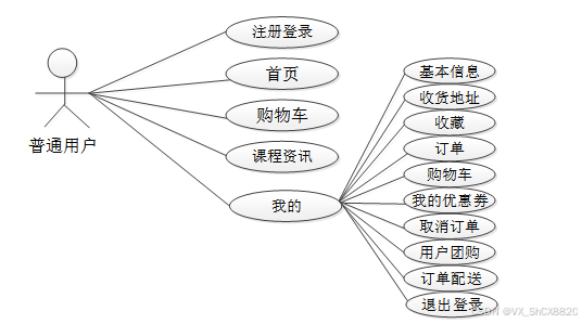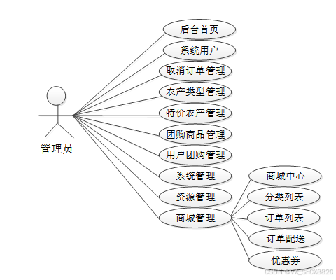 通过2.3功能的分析,得出了基于微信小程序的凉山地区特色农产品团购平台的用例图:
