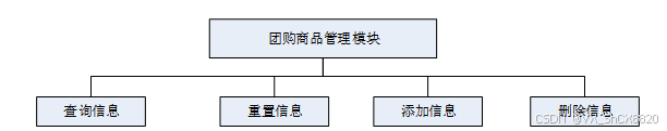 团购商品管理模块是本系统中的重要功能之一。该模块的设计旨在提供对团购商品的发布、编辑、删除和查看等管理功能,以便及时、准确地向系统用户发布相关的团购商品信息。其模块功能结构图如下3-3所示: