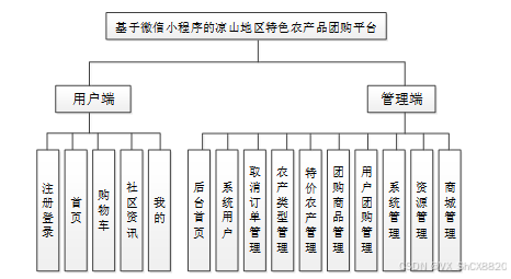 按照基于微信小程序的凉山地区特色农产品团购平台的功能模块,主要包括用户端(普通用户)和管理端(管理员)这两大功能模块。