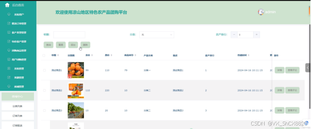 - 团购商品管理:管理员可以查看团购商品列表中某个农产品的详情和评论,可以对团购商品信息进行增删改查操作。