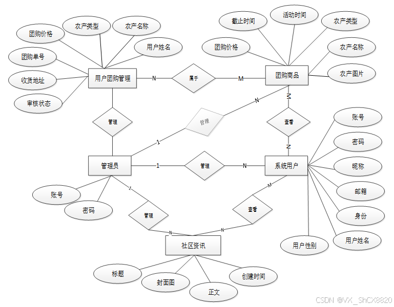 下面是整个基于微信小程序的凉山地区特色农产品团购平台中主要的数据库表总E-R实体关系图。