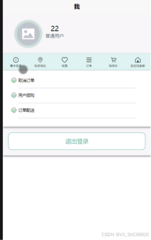 - 我的:用户点击首页右下角“我的”进入页面可以查看和管理基本信息、收货地址、收藏、订单、购物车、我的优惠劵、取消订单、用户团购和订单配送信息;点击“退出登录”即可退出系统登录。