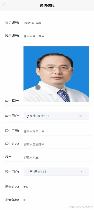 预约信息管理模块:相关权限用户可以进行预约信息的查询、修改、删除操作,也可以对预约编号、医生工号等数据项进行单独操作,设置数据类型等参数。