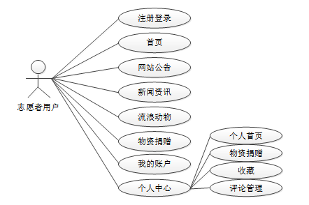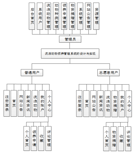 统功能模块包括管理员模块和普通用户、志愿者用户模块,登录进去对应相应的功能。系统功能结构图如图4-1所示。