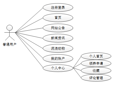 当前,B/S架构的系统[10]提供了一种便捷的数据访问模式:只需点击一下网站,即可获取系统的信息,而且,该信息会被存储,并且会被及时地转交给服务器,从而实现快速、准确的信息交换。普通用户用例图如图3-1所示。