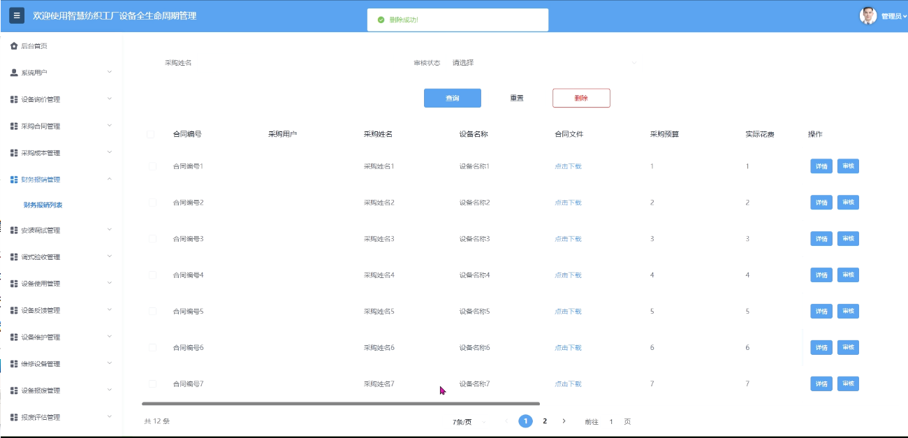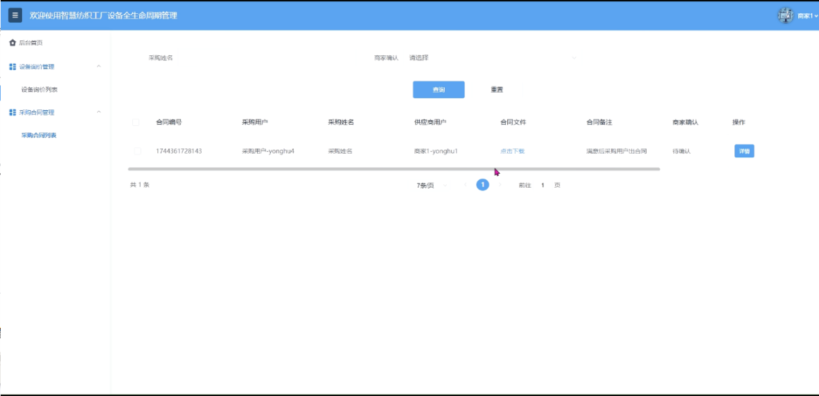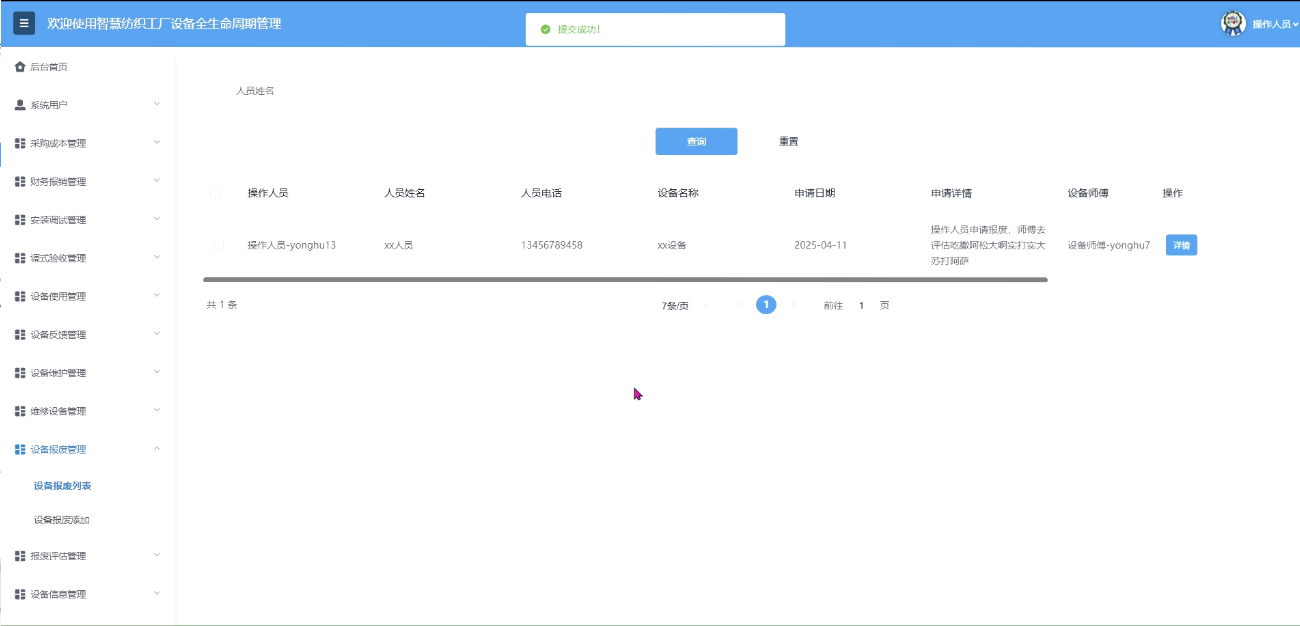 The Smart Textile Factory Equipment Lifecycle Management System based on SpringBoot provides a comprehensive and efficient solution for equipment management in the textile industry. The system covers the entire process from procurement, installation and commissioning, Through an integrated platform, different roles such as operators, equipment technicians, financial users, and suppliers can collaborate efficiently, achieving information sharing and process optimization. For instance, equipment technicians can update installation and maintenance records in real-time, while financial users can quickly process procurement costs and financial reimbursement matters.