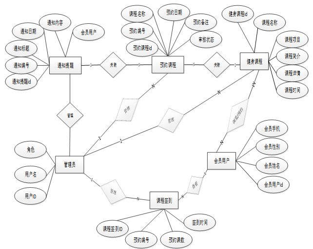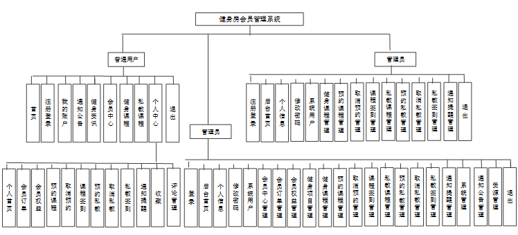 健身房会员管理系统包含会员用户、教练用户和管理员三个角色划分,每个角色对应的主要功能如下: