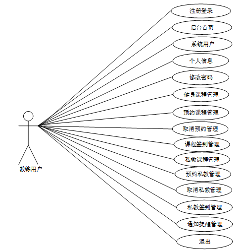 健身房会员管理系统中教练用户包含注册登录、后台首页、系统用户、个人信息、修改密码、健身课程管理、预约课程管理、取消预约管理、课程签到管理、私教课程管理、预约私教管理、取消私教管理、私教签到管理、通知提醒管理等功能。教练用户用例图如下所示: