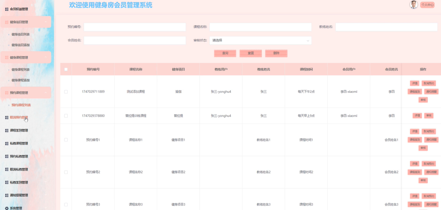 预约课程管理:主要查看和管理所有教练的会员预约课程详情,并进行审核以及推送通知提醒。会员上课时教练需签到,会员剩余课程会减少。支持查询、修改、删除等操作。预约课程管理界面如下图所示。