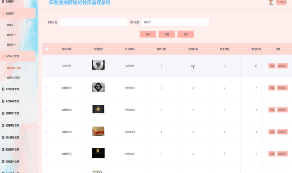 - 取消私教管理:主要查看和管理所有教练的会员的取消私教预约详情,支持查询、修改、删除等操作。