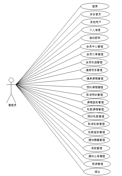 健身房会员管理系统中管理员包含注册登录、后台首页、系统用户、个人信息、修改密码、会员中心管理、会员订单管理、会员权益管理、健身项目管理、健身课程管理、预约课程管理、取消预约管理、课程签到管理、私教课程管理、预约私教管理、取消私教管理、私教签到管理、通知提醒管理、系统管理、通知公告管理、资源管理等功能。管理员用例图如下所示:
