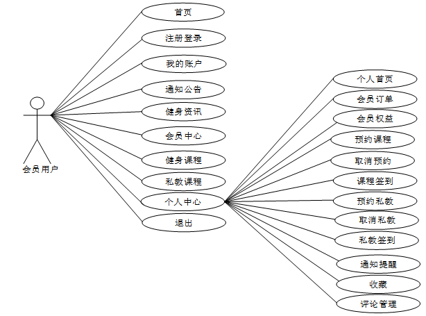 健身房会员管理系统中会员用户包含注册登录、首页、我的账户、通知公告、健身资讯、健身课程、私教课程、个人中心等功能。会员用户用例图如下所示: