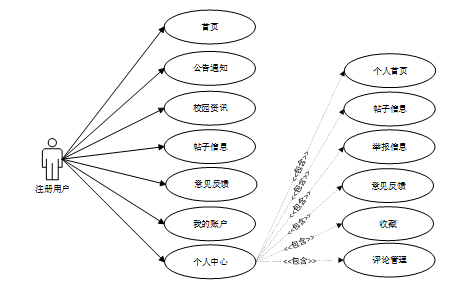 本校园服务平台旨在为注册用户和管理员提供一个高效、便捷的信息交流和服务管理环境。系统主要分为两大角色模块,针对注册用户提供个人中心、信息浏览与互动等功能;为管理员则设计了全面的后台管理系统,用于维护平台秩序和内容管理。具体功能描述如下: