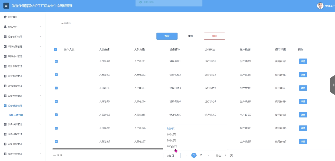 - 设备维护管理:设备维护列表可以查看,用户可以进行查询、重置和详情的查看,以及设备维护添加,确保设备的长期稳定运行。