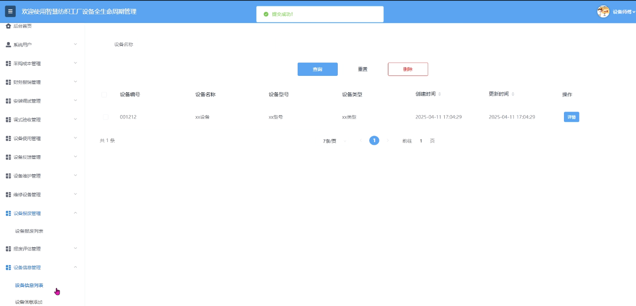 - 设备信息管理:设备信息列表可以查看,用户可以进行查询、重置、删除和详情的查看,以及设备信息添加,全面掌握设备信息。