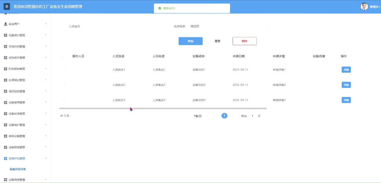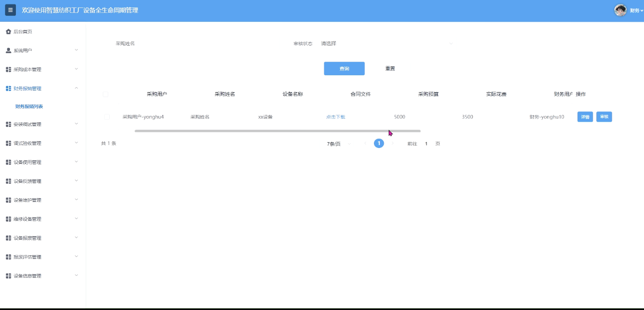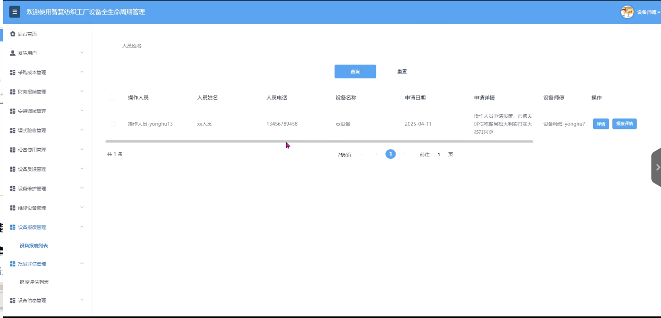The Smart Textile Factory Equipment Lifecycle Management System based on SpringBoot provides a comprehensive and efficient solution for equipment management in the textile industry. The system covers the entire process from procurement, installation and commissioning, Through an integrated platform, different roles such as operators, equipment technicians, financial users, and suppliers can collaborate efficiently, achieving information sharing and process optimization. For instance, equipment technicians can update installation and maintenance records in real-time, while financial users can quickly process procurement costs and financial reimbursement matters.