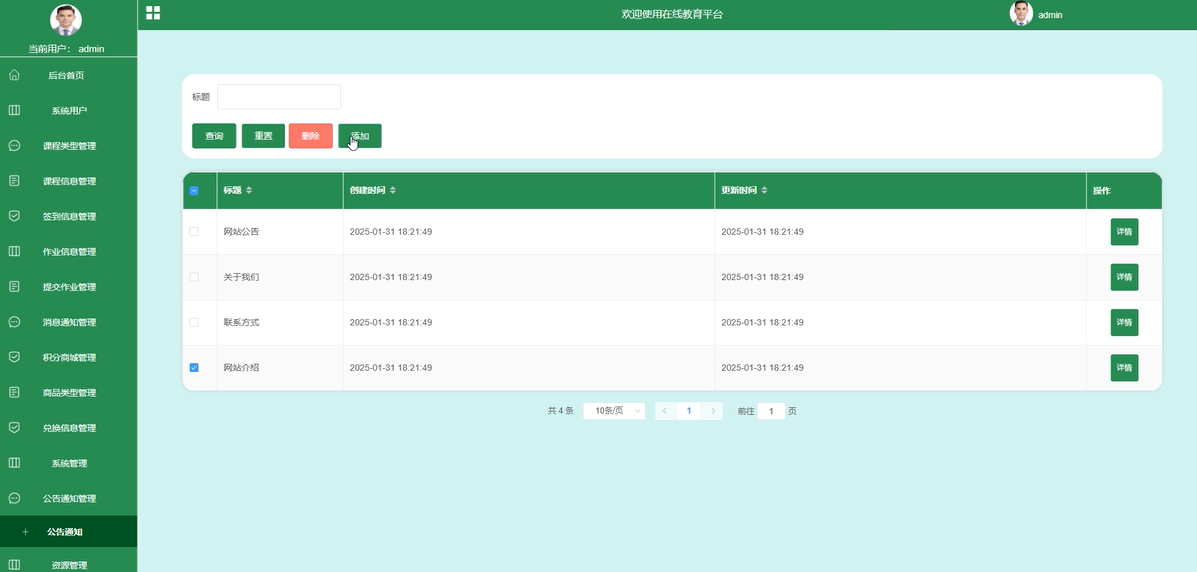 在开发在线教育平台时,后端采用了Java作为编程语言,并利用了SpringBoot框架,这使得复杂的业务逻辑和数据操作得以高效完成。与此同时,系统的数据存储和管理通过MySQL数据库实现。结合Vue.js作为前端框架,具有数据绑定和组件化的特点,能够有效地提升用户体验和开发效率。在开发工具的选取上,使用了eclipse,它的强大功能和易用性使得编程工作更为高效;而Navicat作为数据库管理工具,使得数据库操作更为方便和快捷。这样的技术选择,确保了管理系统的开发流程既高效又稳定。本系统主要实现包括系统用户、课程类型管理、课程信息管理、签到信息管理、作业信息管理、提交作业管理、消息通知管理、积分商城管理、商品类型管理、兑换信息管理、系统管理、公告通知管理、资源管理、在线考试。等功能进行管理。