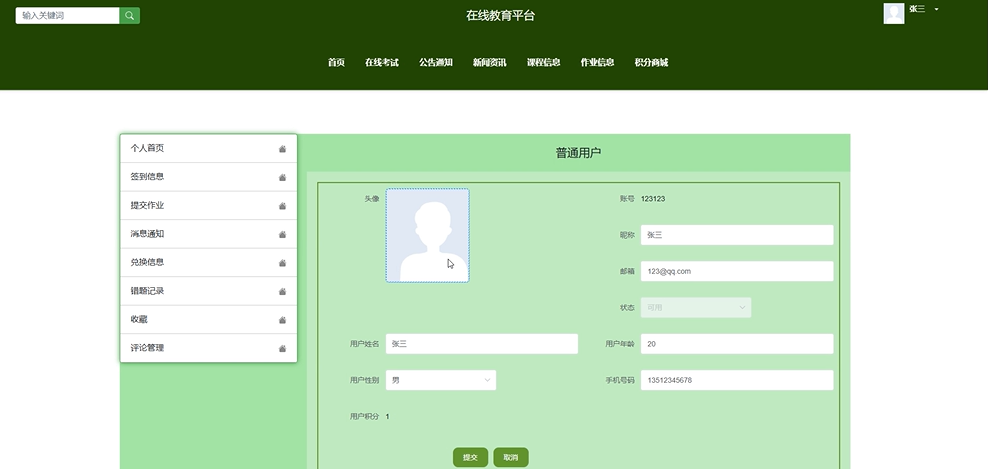 个人中心:包括个人首页、签到信息、提交作业、消息通知、兑换信息、错题记录、收藏、评论管理等功能,全面记录学习历程。