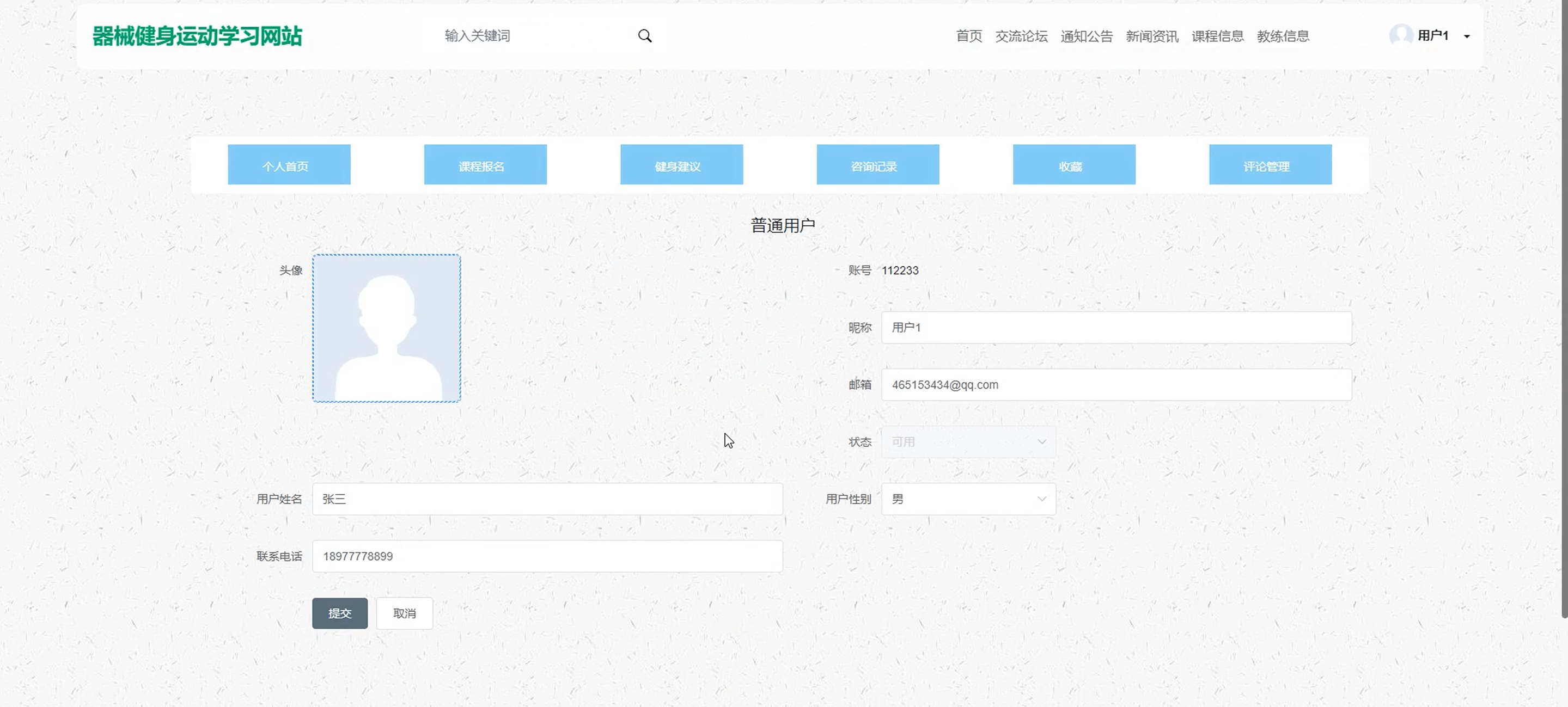 个人首页:展示用户的个人信息、健身进度、课程报名记录等,提供个性化的健身建议和计划。