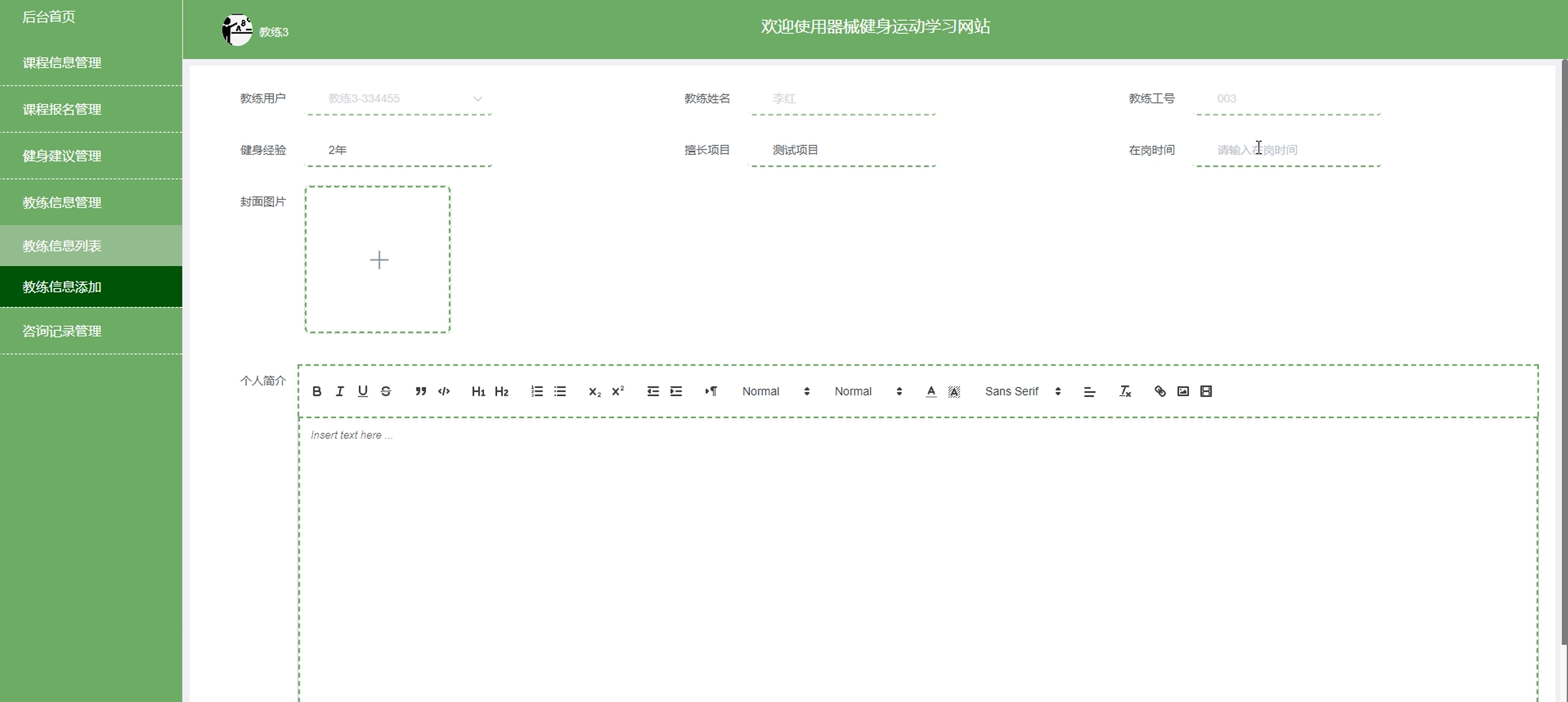 教练信息管理:教练可以查看和更新自己的个人信息、擅长项目、健身经验等,确保学员能够了解教练的专业背景和教学风格。