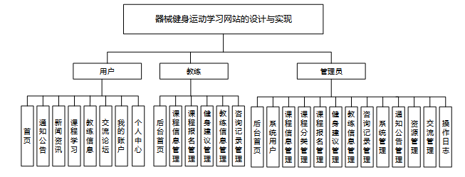 器械健身运动学习网站系统旨在通过不同角色的功能模块实现对健身平台的全面管理。系统主要分为用户、教练和管理员两大角色,每个角色都有其独特的功能模块,以确保健身平台运营的高效性和透明性。