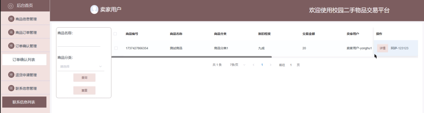 用户可以查看联系信息列表中某个用户发送的信息详情并进行回复,可以对列表信息进行查询和重置操作。支持通过输入商品名称或选择商品分类来查询相关联系信息。其界面图如下图5.10所示。