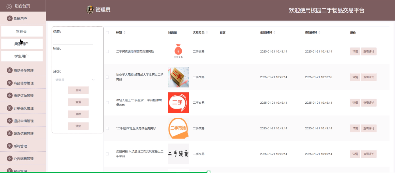 This paper introduces the design and implementation process of a campus second-hand goods trading platform developed based on the Spring Boot framework. The platform mainly targets three types of user groups: student users, seller users, and administrators, and provides diversified functional services. Student users can register and log in through the platform, browse the homepage's carousel, news, announcements, and product recommendations, like, bookmark, comment, and purchase on the product details page, and directly contact sellers. The personal center allows for the management of personal information, viewing of order status, and processing of return requests.