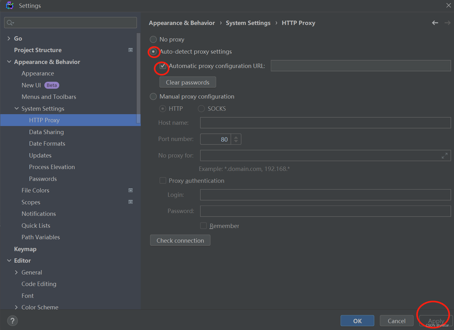 打开file->Appearance&Behavior->System Settings->Http Proxy 然后勾选下图所圈的区域即可