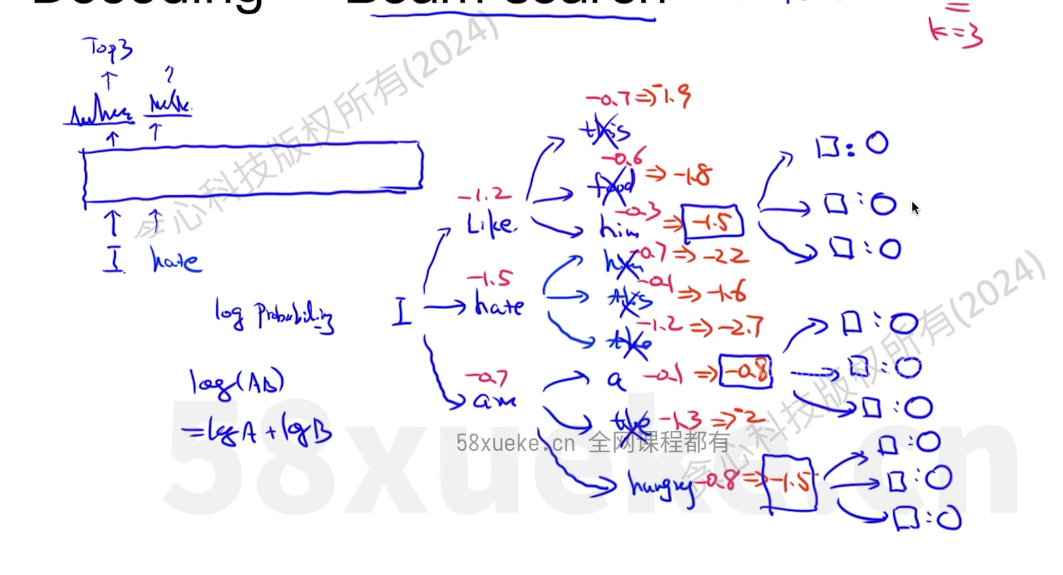例子:beam size(3):输入I,得到概率分布,选出几个概率值(本例为top3:like、hate、am),每个单词本身有概率,计算log probability,值变为负数(比如-1.2、-1.5、-0.7)。假设下一个单词是like,还会有一个分布(top3:this、food、him,取log后为-0.7,-0.6,-0.3);假设下一个单词是hate,同样取top3(him、this、the|-0.3、-0.1、-1.2);对于am同理。现在扩展为了9个,在这一轮节点中做取舍,取舍标准为:留下目前为止这条路径的分值之和最大的前3个。对这三个继续延展,重复之前的操作。