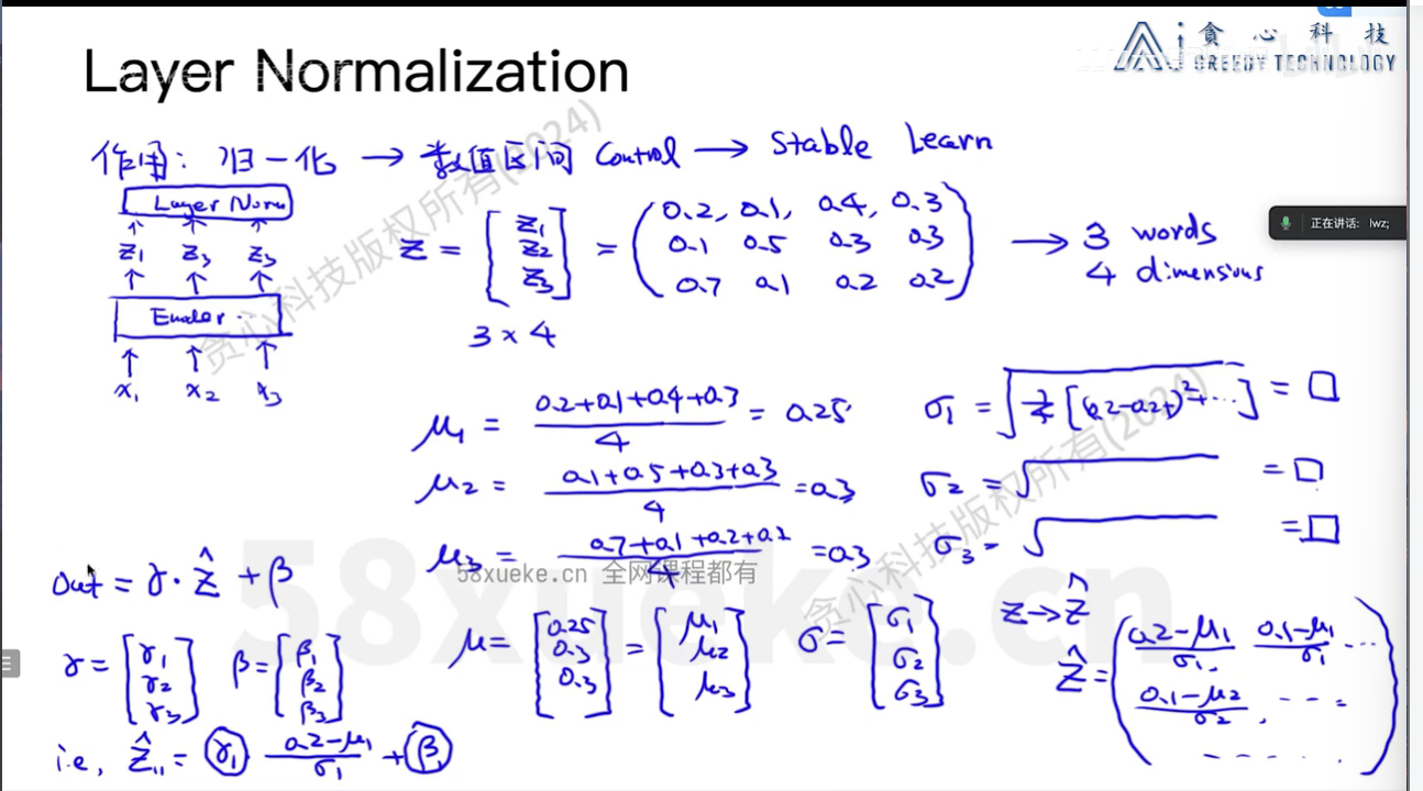 实现:计算每一行的均值和方差(标准差),对于初始矩阵Z中的每个元素,减去均值后初除以准差进行归一化,输出时乘以α,加上β。后面两个参数可以在学习中获得最优值。