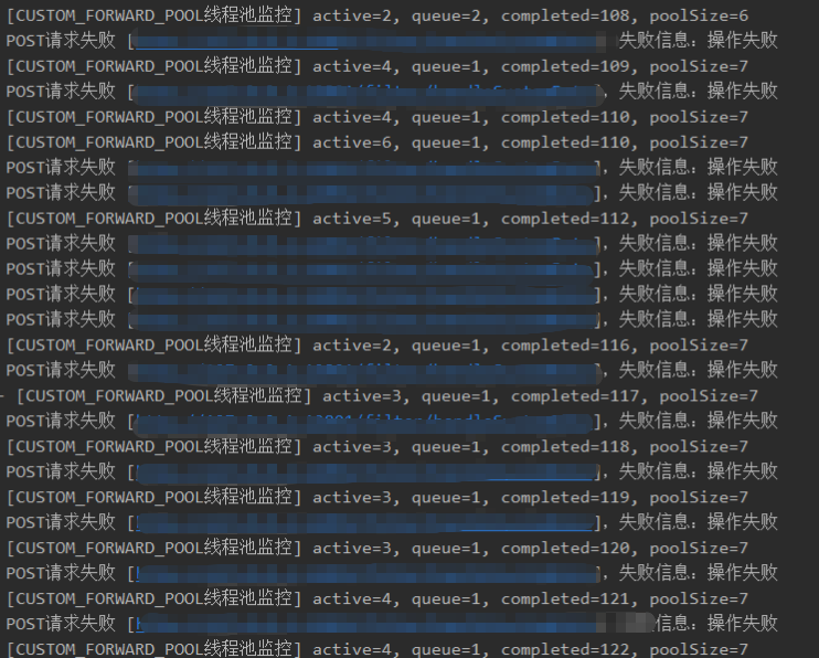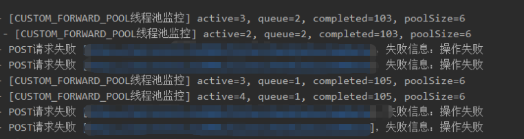 log.warn("[CUSTOM_POOL线程池监控] active={}, queue={}, completed={}, poolSize={}",