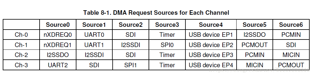 如果通过DCON寄存器选中H/W DMA请求模式,DMA控制器的每一个通道可以从四个DMA源中选择一个DMA请求源。(注意:如果S/W请求模式被选中,则这个DMA请求源将没有任何意义)。下表显示了每个通道的四个DMA