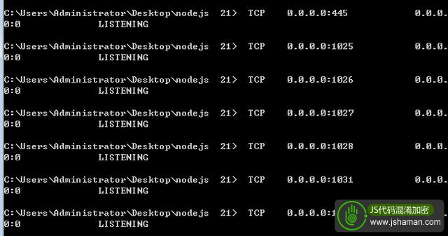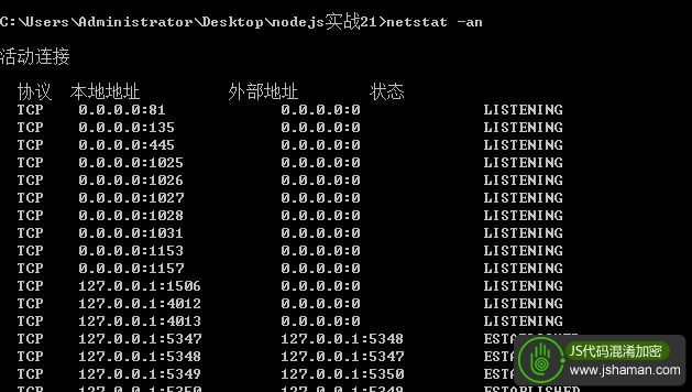 异同在于,这里的输出,中间有空格。这是因为输出是实时进行的,netstat -an获得一个内容,会立刻传给echo,echo又通过process.stdout打印出来。
