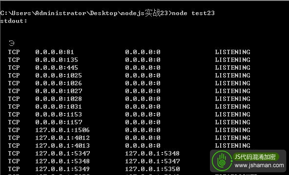 cp.exec("echo | netstat -an",function(err,stdout,stderr){
