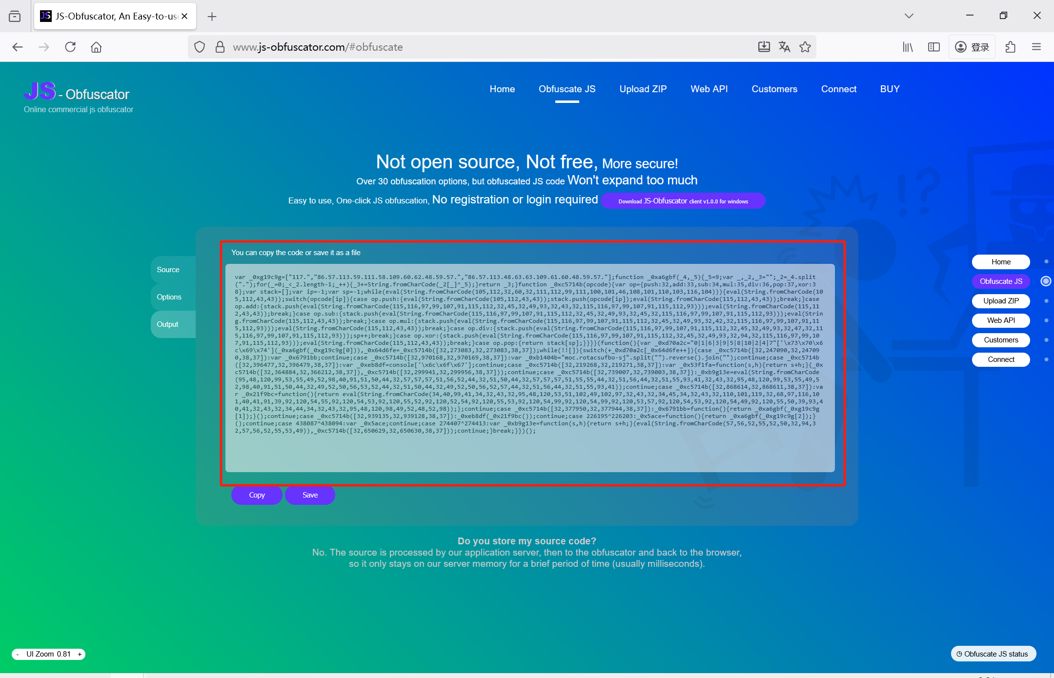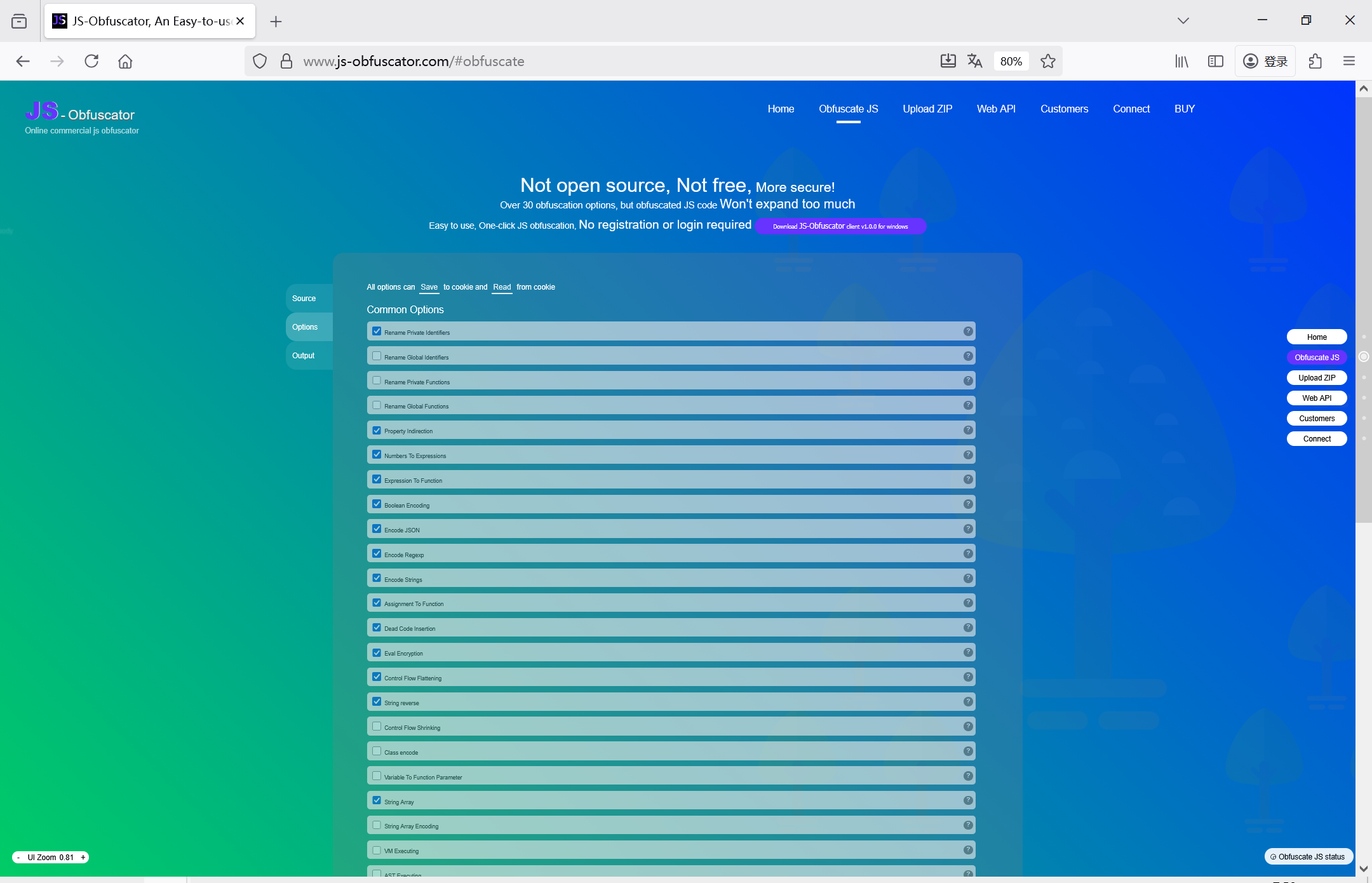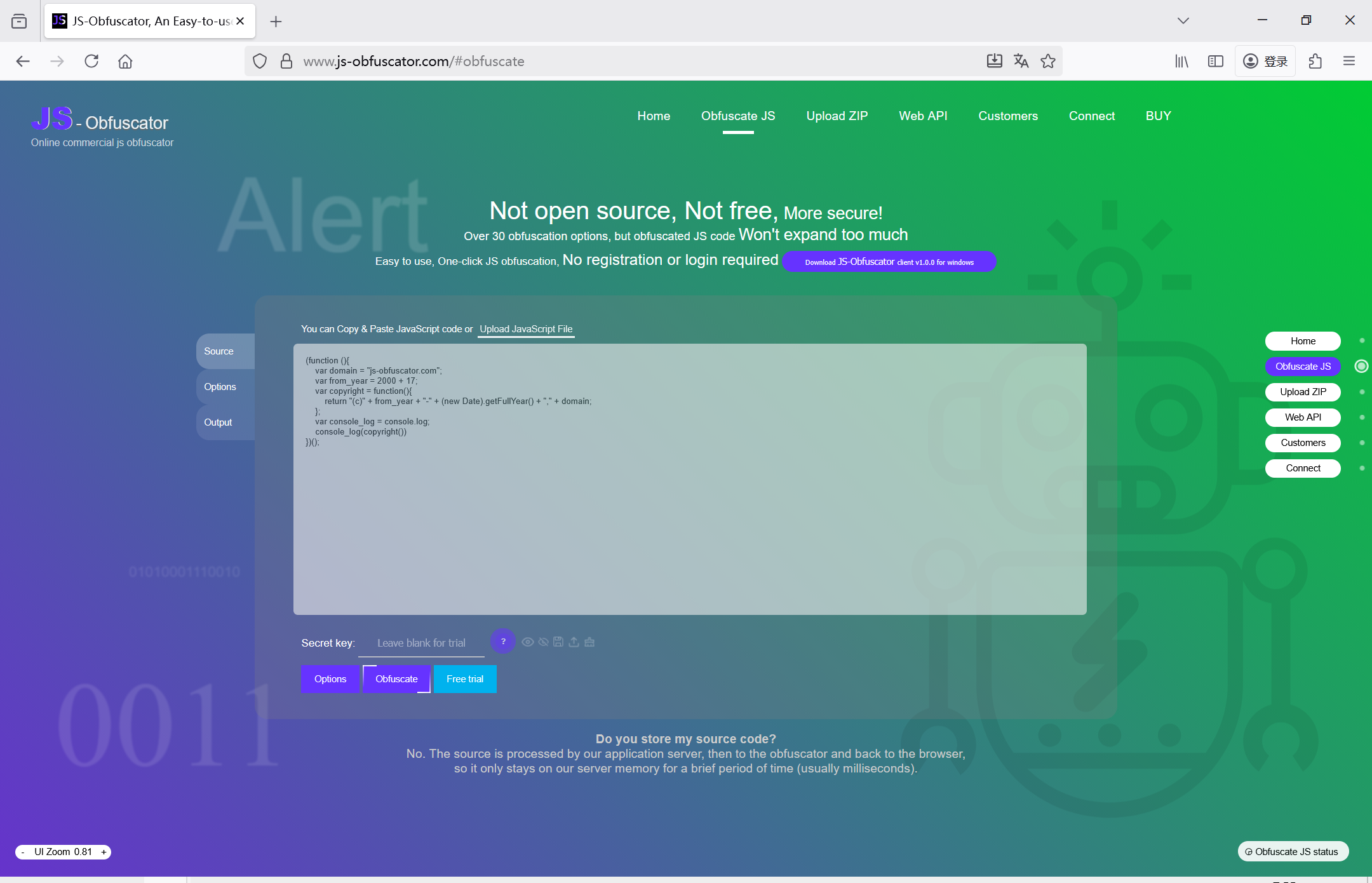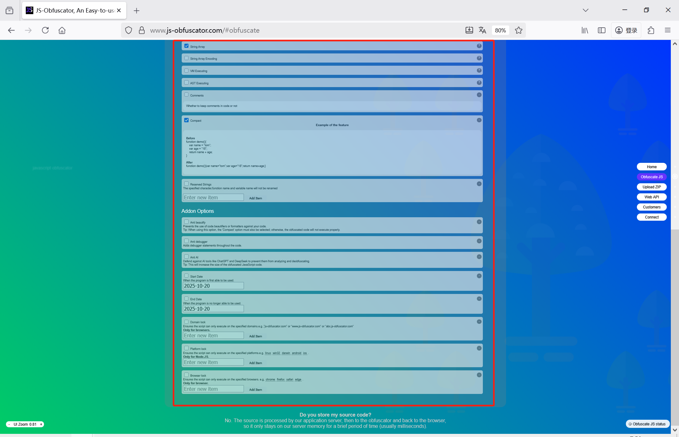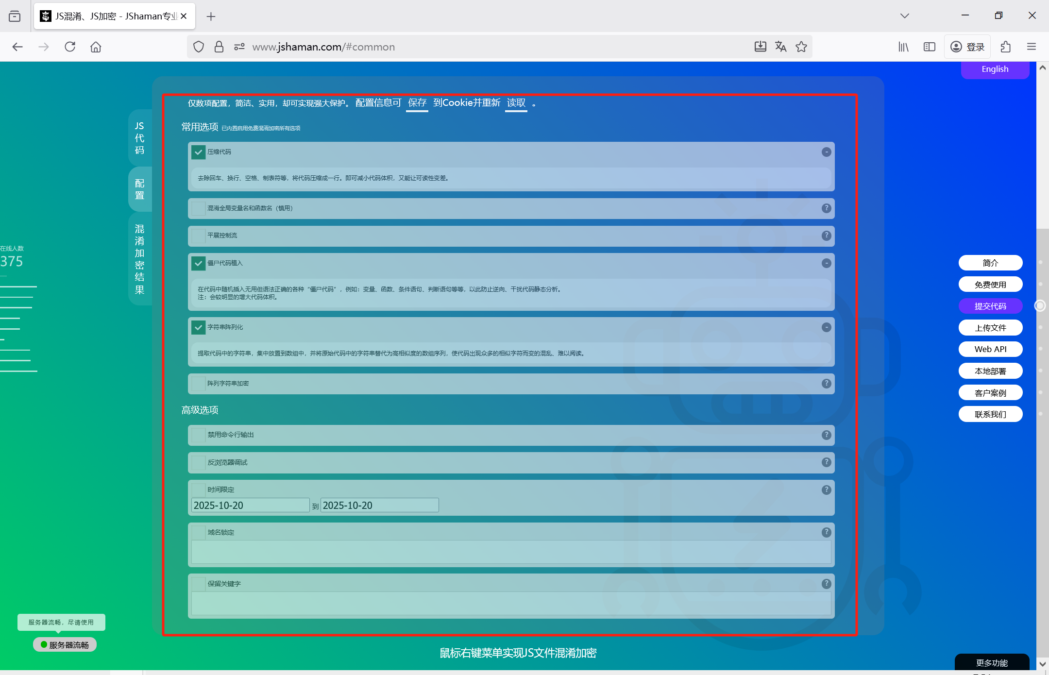 对JS代码混淆加密的操作是一样的,都是:先提交JS代码,然后配置,然后获得加密结果。