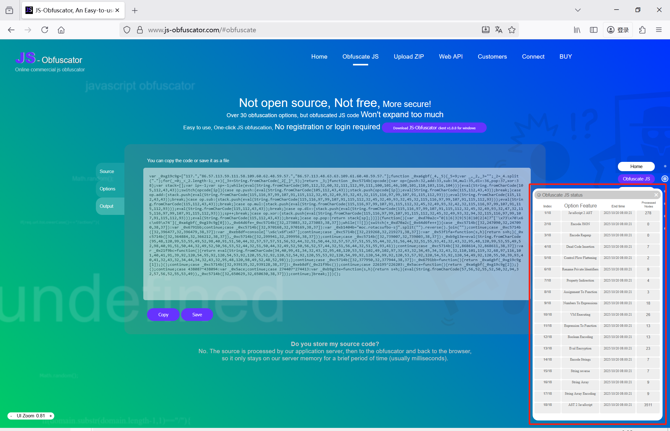 海外版还会显示启用了多少加密选项,以及各功能处理了多少数据节点(注:它在进行JS混淆加密时,会将JS代码转化成AST抽象语法树,这里的节点量指的是对多少个AST节点进行了混淆加密处理。):